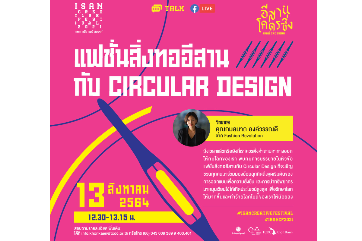 ถึงเวลาแล้วหรือยังที่เราควรตั้งคำถามหาทางออกให้กับโลกของเรา พบกับการบรรยายในหัวข้อ แฟชั่นสิ่งทออีสานกับ Circular Design ที่จะเชิญชวนทุกคนมาร่วมมองย้อนฉุกคิดถึงจุดเริ่มต้นของการออกแบบเพื่อความยั่งยืนและการนำทรัพยากรมาหมุนเวียนใช้ให้เกิดประโยชน์สูงสุด เพื่อรักษาโลกให้มากขึ้นและทำร้ายโลกใบนี้ของเราให้น้อยลง